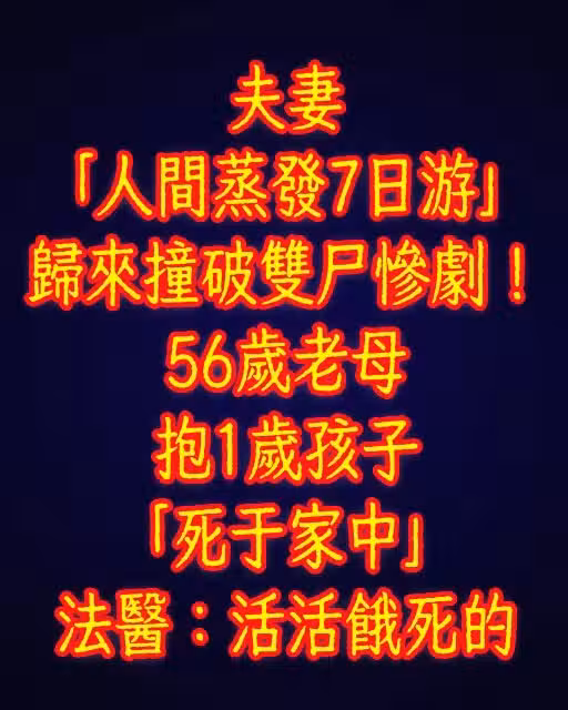 夫妻「人間蒸發7日游」歸來撞破雙屍慘劇!56歲老母抱1歲孩子「死於家中」法醫:活活餓死的!
