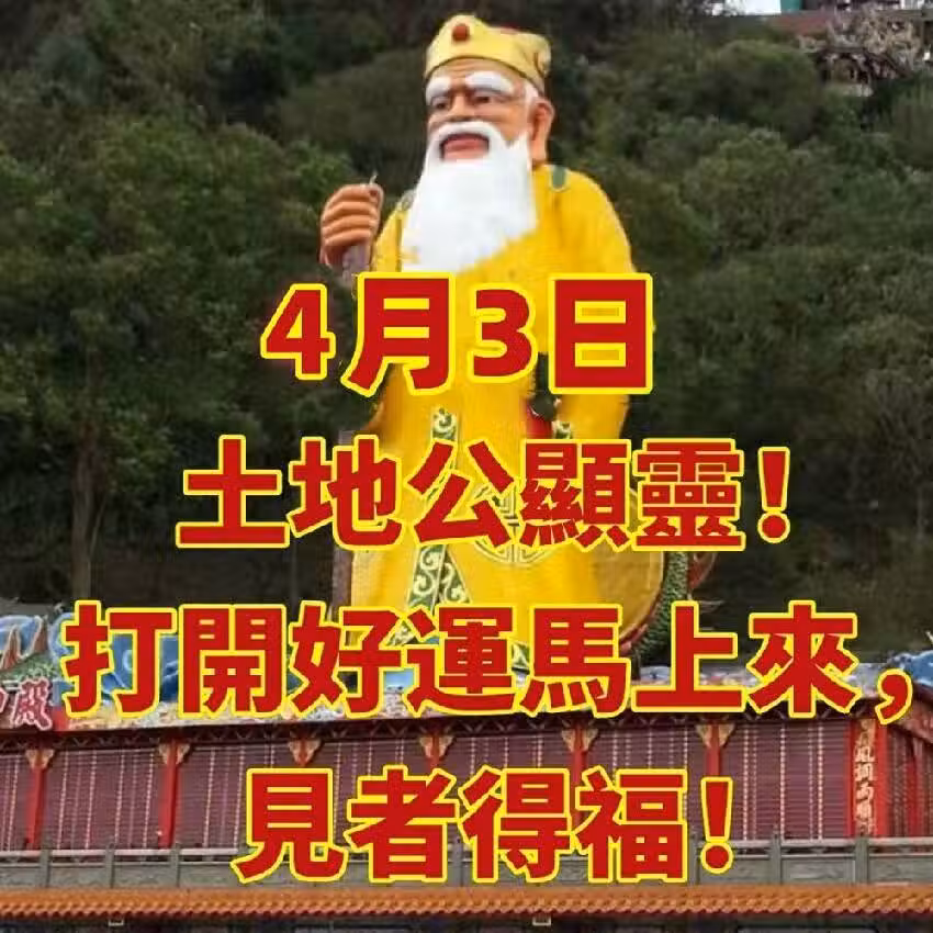 4月3日,土地公顯靈!打開好運馬上來,見者得福!下半年身體安康發大財!真的靈!土地公會留在人間三天,這三天大家別忘了接土地公,我接了;土地公說了:按贊【好運到】留言【一路發】轉走【中大獎】