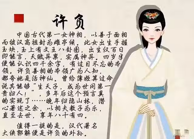 許負年輕時遇到過一個魏國小女孩,她看小姑娘的面相說,姑娘,不出意外你能生下天子。小姑娘信不信不知道,反正她老公魏王豹信了,這個小姑娘就是魏王豹的寵妃薄姬。