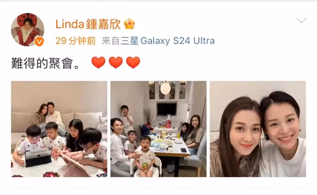 4月4日,鍾嘉欣在社交平台曬出帶著女兒去胡杏兒家聚會的照片,並配文「難得的聚會」。鍾嘉欣母女倆,加上胡杏兒母子四人,倆女神帶娃聚會溫馨熱鬧!
