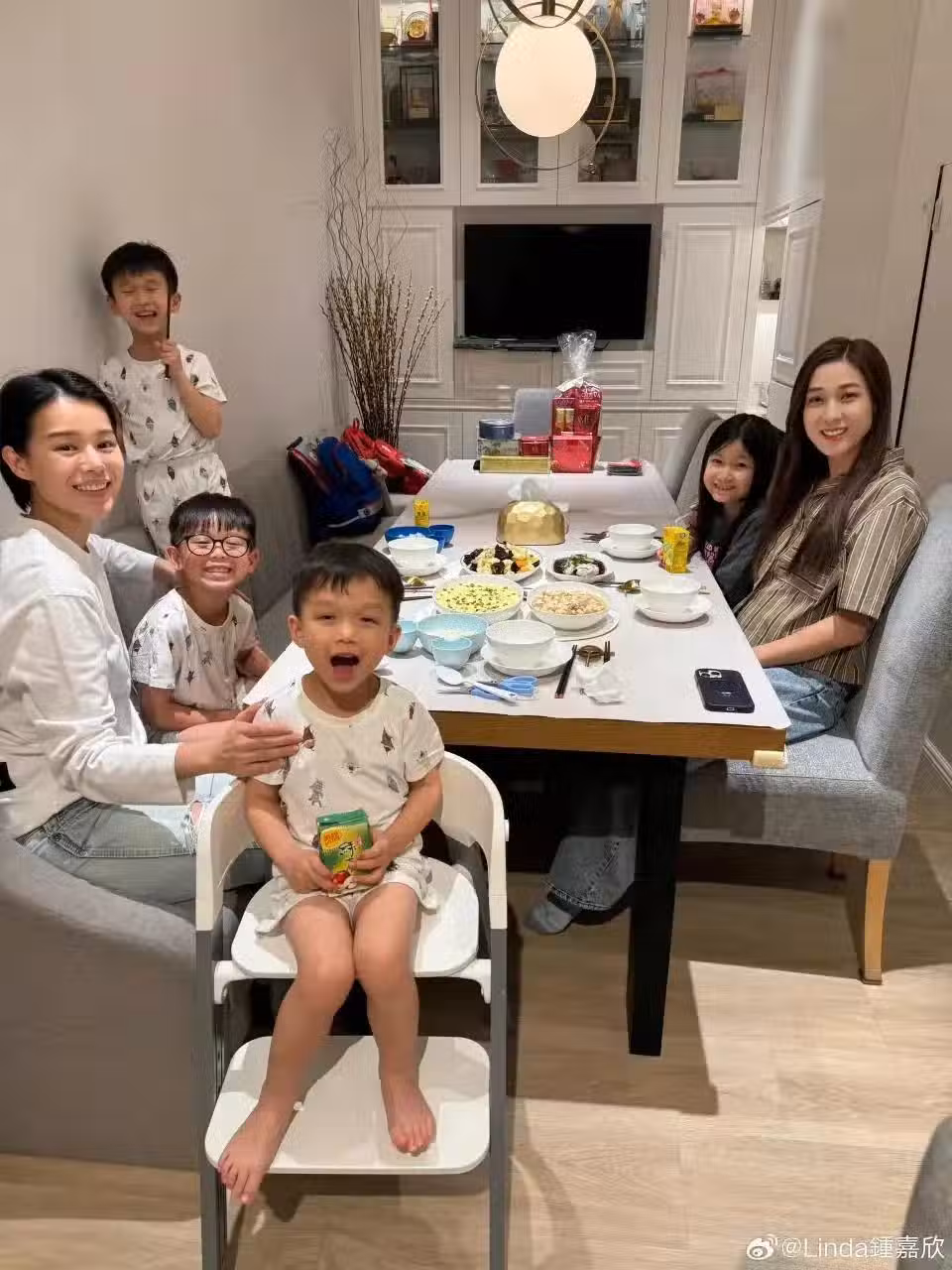 照片中,只見鍾嘉欣母女倆還在胡杏兒家一起吃飯,鍾嘉欣披著一頭長髮,身穿條紋襯衫和牛仔褲,休閒裝打扮看起來漂亮有氣質。8歲的女兒Kelly 留著一頭跟媽媽同款的長髮,看起來青春靚麗,出落得亭亭玉立,跟媽媽很像呀。胡杏兒身穿白色上衣和牛仔褲,打扮簡單時尚。胡杏兒三個兒子穿著同款家居服,看起來帥氣可愛。