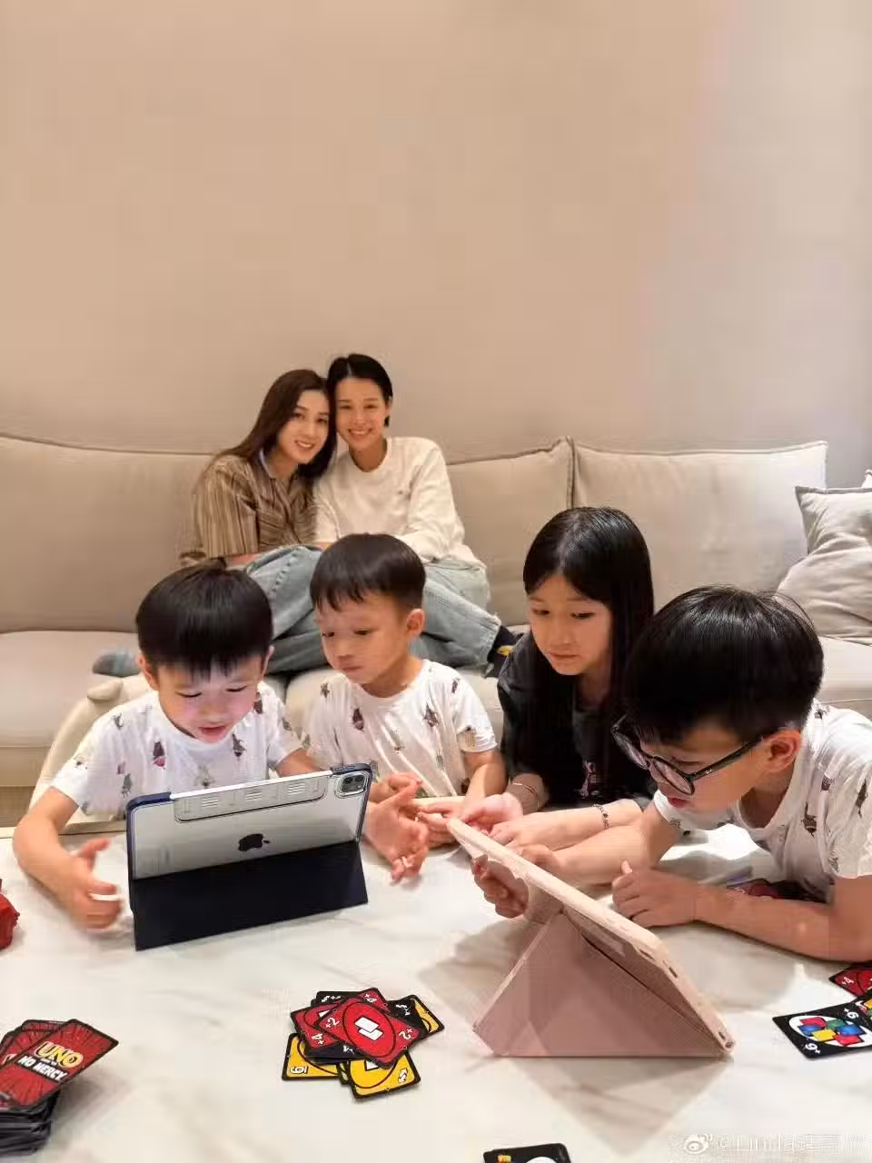 胡杏兒跟鍾嘉欣坐在沙發上聊天,四個小朋友就坐在一起玩。鍾嘉欣女兒跟胡杏兒三個兒子一起看平板其樂融融,因為Kelly跟胡杏兒7歲的大兒子奕霆年紀相仿,加上鍾嘉欣以前也帶著女兒去過胡杏兒家,所以小朋友們也能玩到一起。看著這樣溫馨的畫面,感覺很幸福呀。
