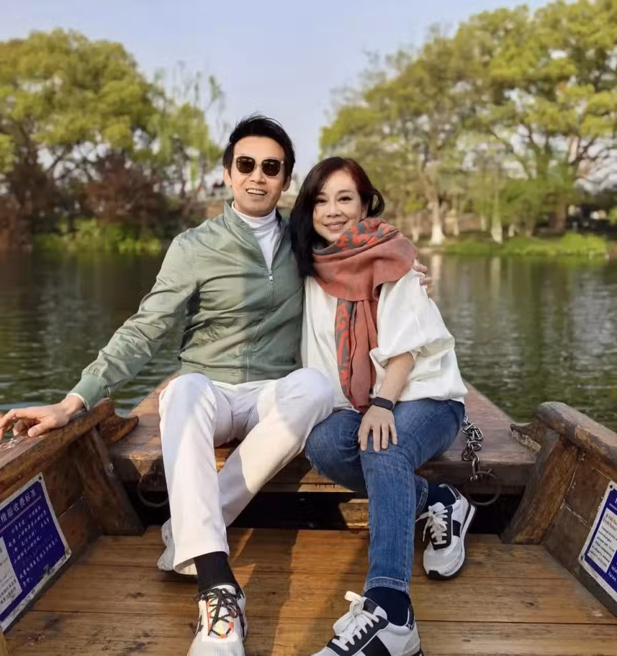 54歲陳松伶在杭州,和老公坐船游西湖,皮肉鬆弛,看起來蒼老好多