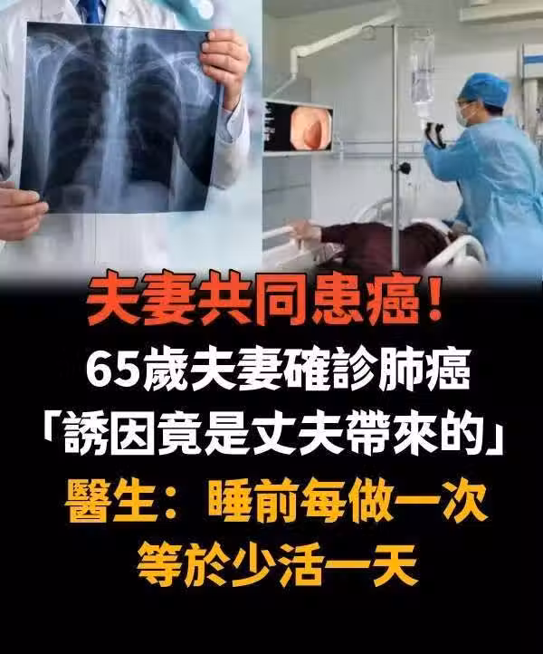 夫妻共同患癌!65歲夫妻確診肺癌「誘因竟是丈夫帶來的」 醫生提醒:睡前每做一次等於少活一天!