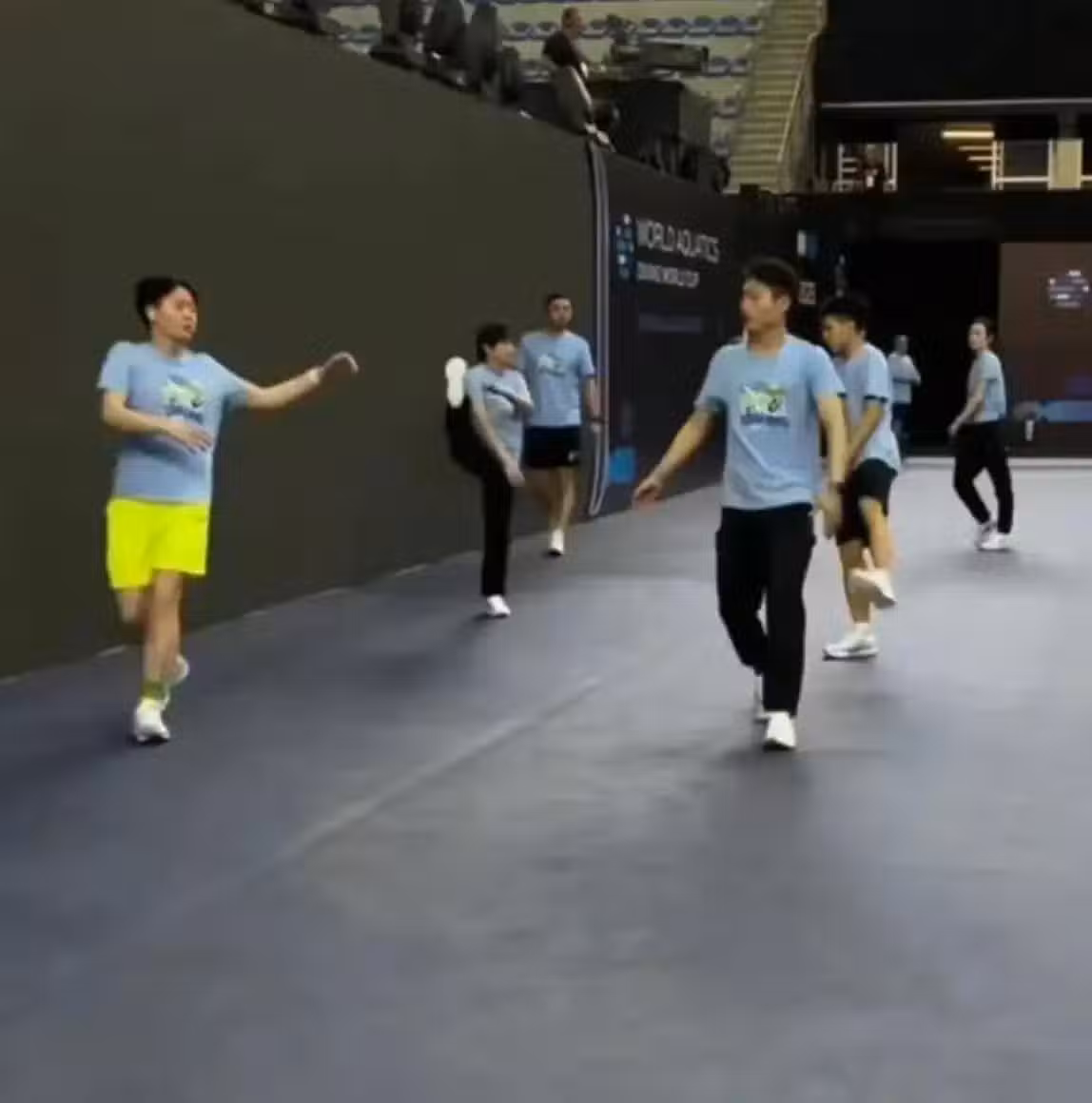 世界泳聯的鏡頭掃過訓練場:陳藝文黃襪子配運動鞋,壓腿時還不忘跟隊友插科打諢;王宗源擦汗的手錶反光晃到鏡頭,被彈幕戲稱"最貴植入";昌雅妮專注到落單,站姿一字馬直得能當量尺用。