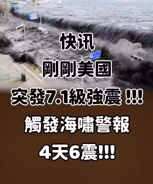 快訊/剛剛,美國突發7.1級強震 !!!觸發海嘯警報,4天6震!!!