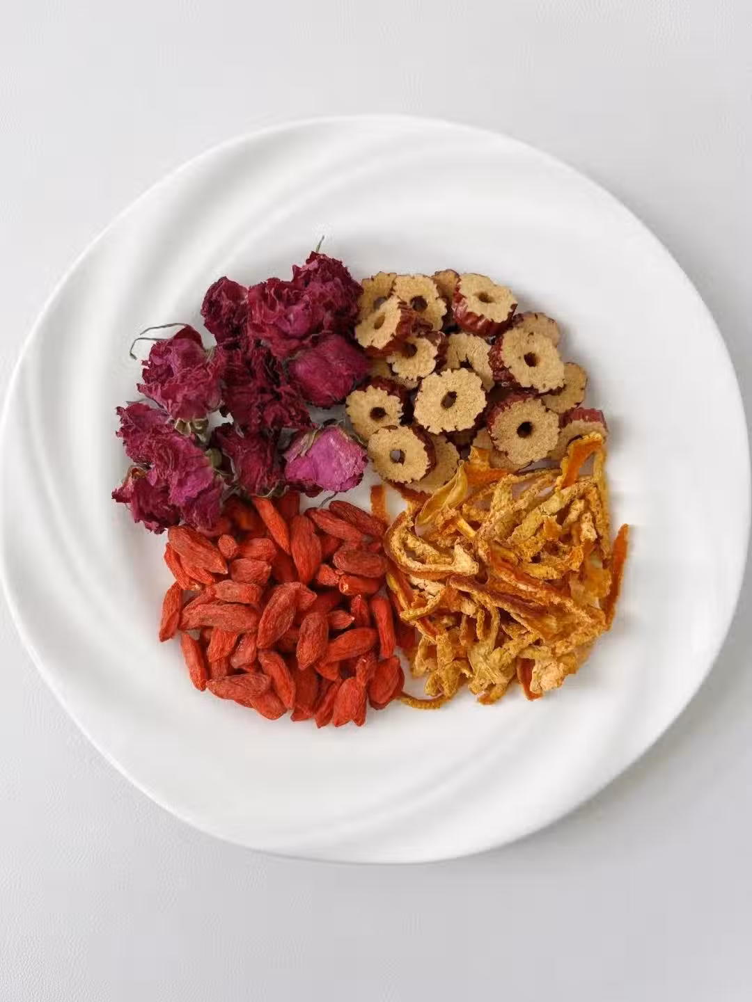 食材:玫瑰花7朵、陳皮5小片、紅棗5個、枸杞 4g