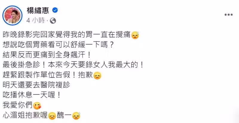 她還帶著完整的妝發、假睫毛也沒卸掉;她透露原本回家後,想說可以吃個胃藥舒緩一下,沒想到根本壓制不住病情,最後掛急診,原本是要去錄藍心湄的節目,沒想到現在躺在病床上難以動彈。