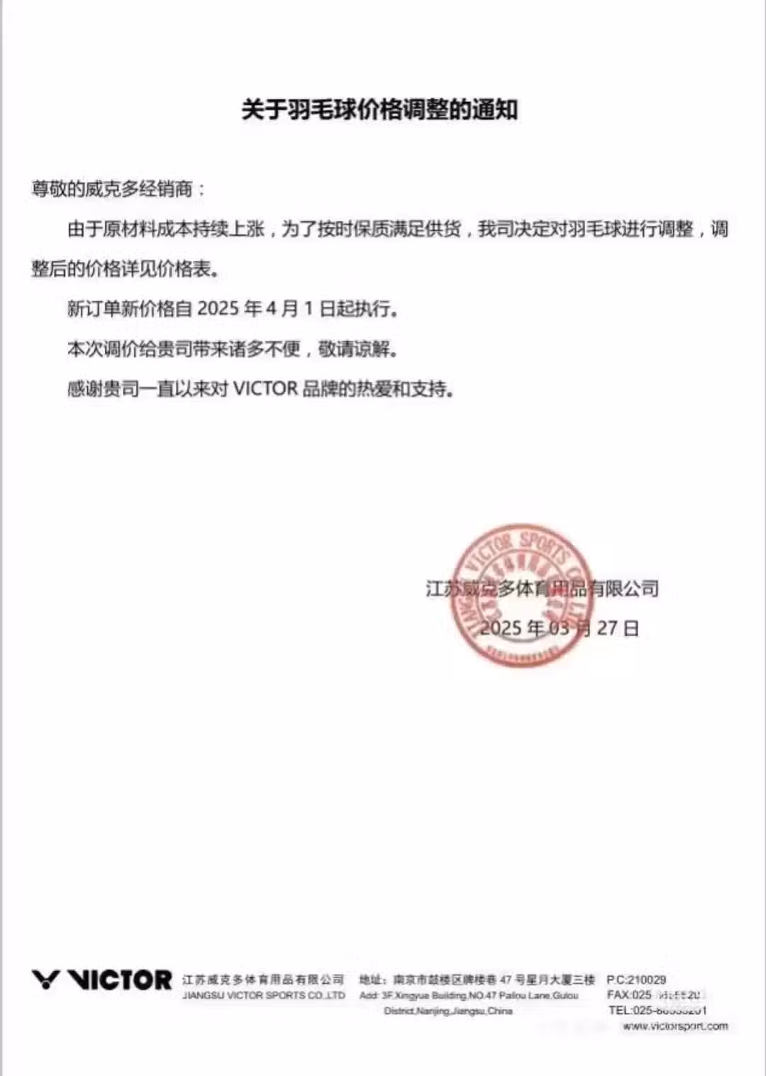近期,羽毛球頭部品牌威克多再次調價的通知流傳網絡。通知稱,由於原材料成本持續上漲,於4月1日起對羽毛球進行調價。與一年前相比,威克多鵝毛、鴨毛系列羽毛球產品幾乎全線漲價,漲幅在15%-50%,更有部分型號漲幅甚至超過了60%,而與同期黃金漲幅也僅達到50%。