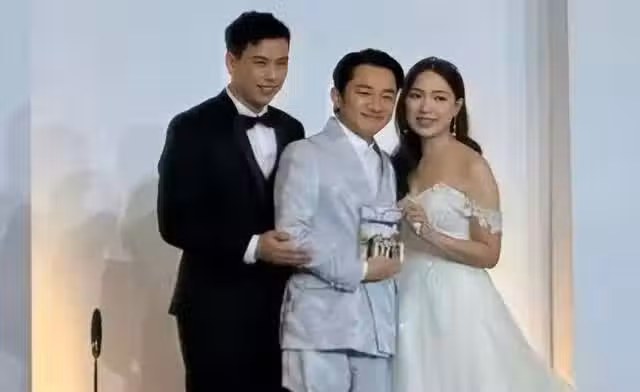 至於王祖紅的老公,則選擇非常經典的黑白色西裝禮服,繫著領結,相當正式。而他看上去長相憨厚,比較斯文。