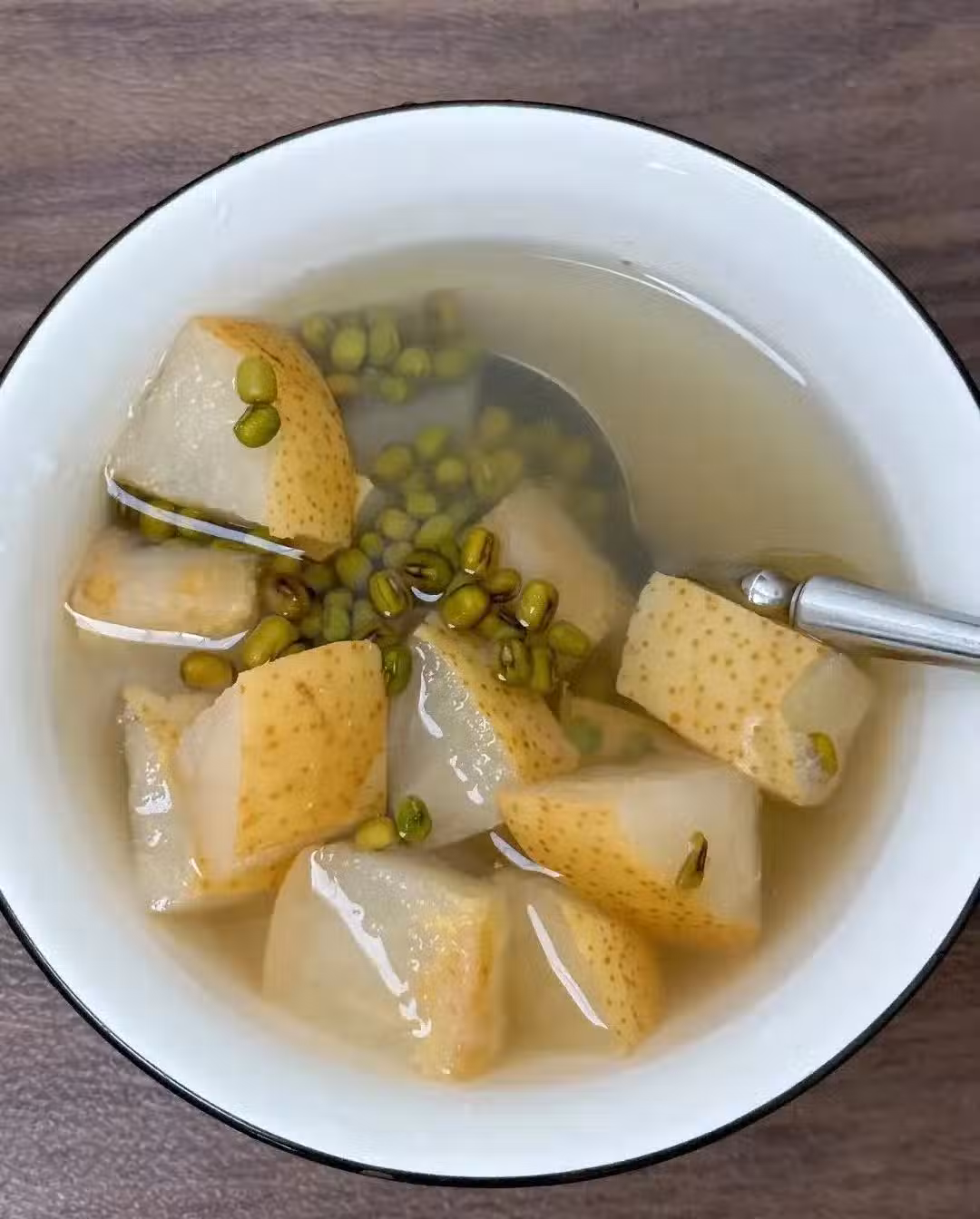 【✅食材準備】 : 雪梨一個、綠豆一小把; 【✅做法】 : 1、雪梨用鹽把表皮搓洗乾淨,去核切成小塊,放入鍋中,倒入適量的清水大火煮開,轉中小火煮30分鐘; 2、接著加入清洗乾淨的綠豆,煮至沸騰後轉中小火繼續煮5分鐘即可飲用; 3、注意:綠豆不需要提前泡發,也不要煮到破皮開花,開花了清熱效果沒那麼好;
