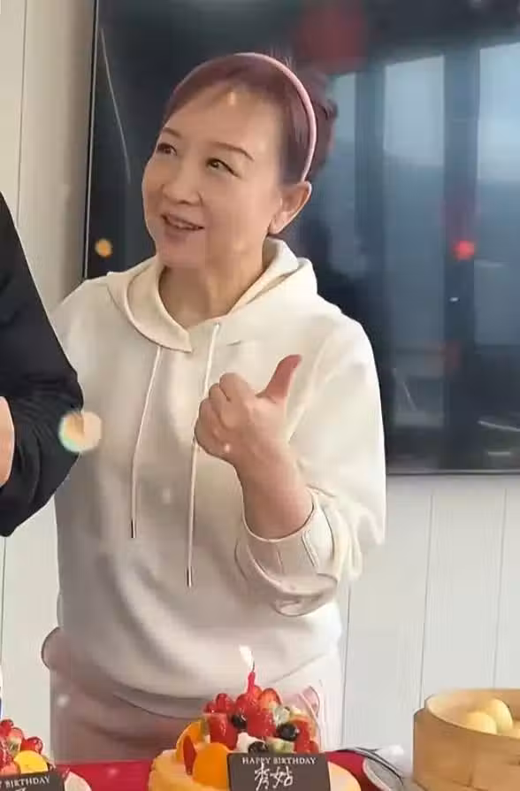 69歲的黃杏秀穿著一件白色帶帽衛衣,扎著丸子頭,戴著粉色發箍,狀態非常好!--------------------------------------