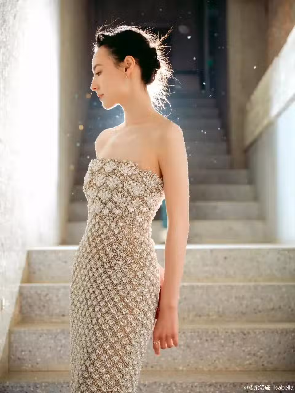 36歲梁洛施出席時尚活動,身穿抹胸長裙氣質高貴,戀愛後容光煥發