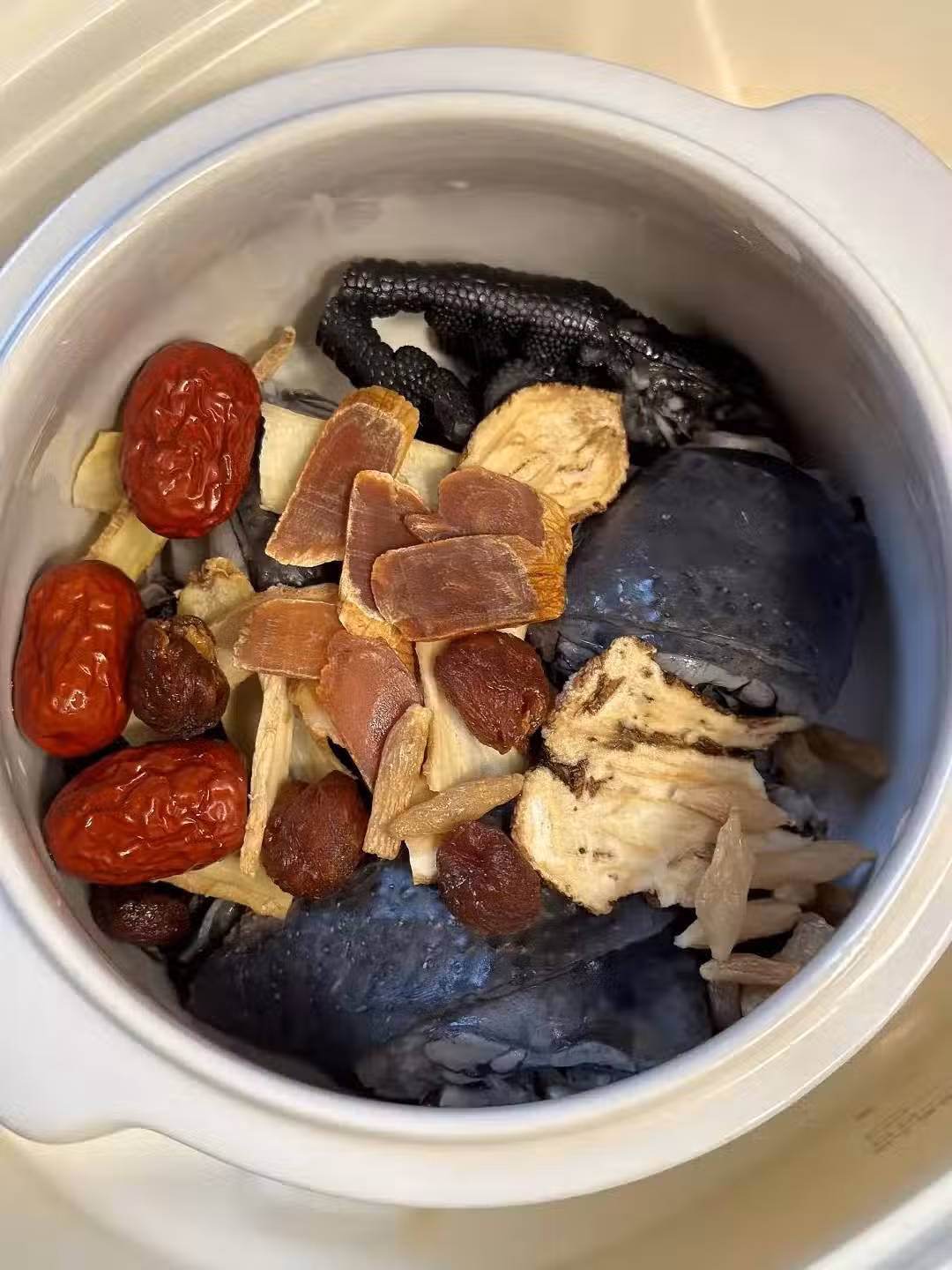 食材(2人份):紅參片 5片、當歸 6克、玉竹 10克、麥冬 10克、桂圓乾 4顆、紅棗 3顆(去核)、枸杞 1小把、烏雞 半隻(約300克)