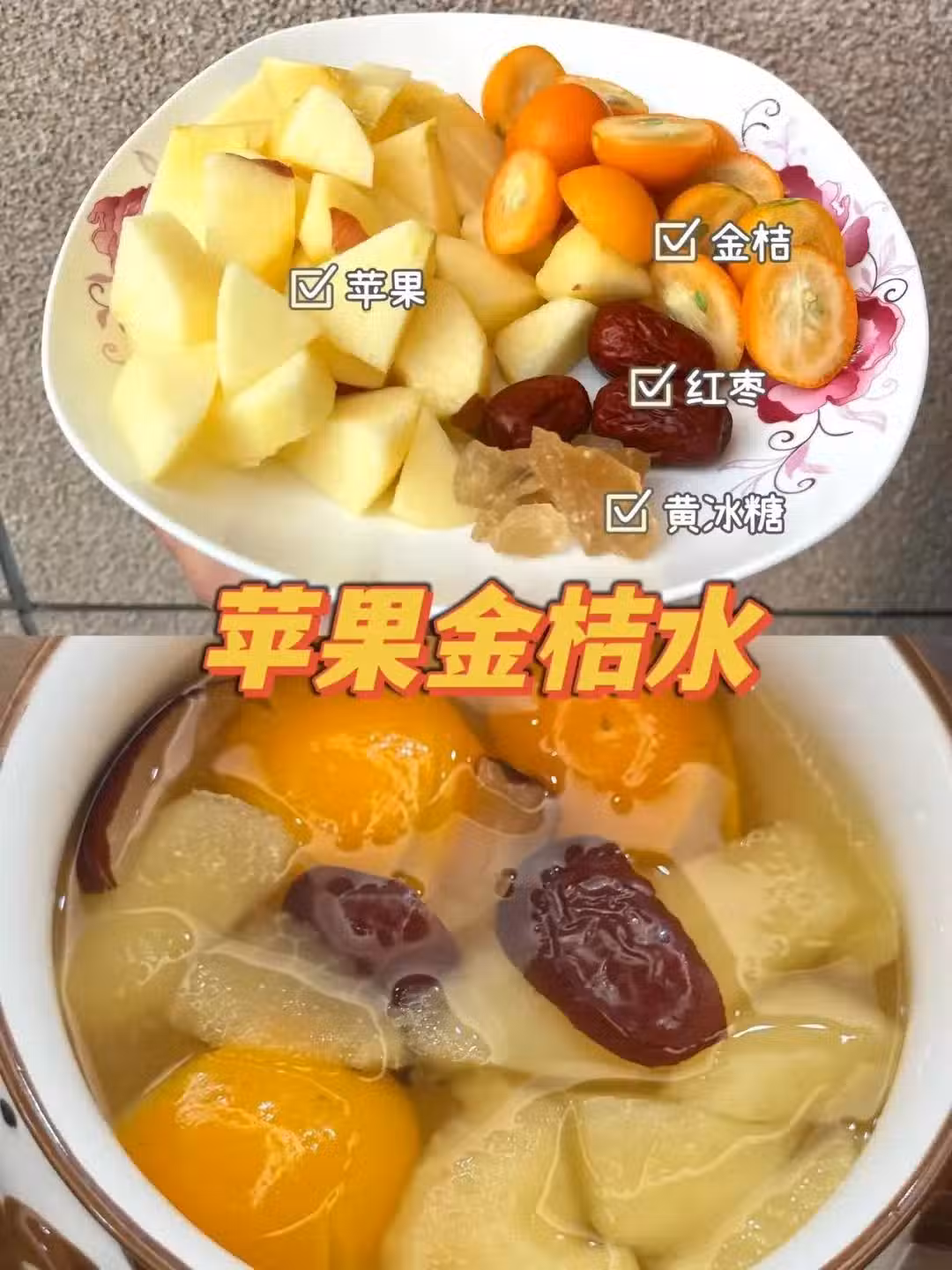【食材】 蘋果1個、金桔8個、紅棗3個、黃冰糖(少放或者不放都可以) 【做法】 蘋果去皮切塊,金桔用鹽搓洗乾淨,切成對半,紅棗洗凈去籽,所有材料加入養生壺,加1500ml水煮15分鐘即可。