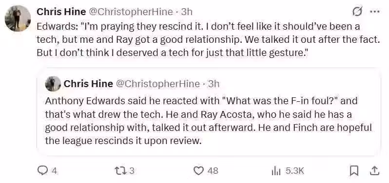 要知道3月1號比賽愛德華茲就因技犯達到16次被禁賽一場無緣對陣爵士,然後森林狼輸了,這位當家球星顯然不想再重蹈覆轍,何況是在衝擊季後賽最關鍵的階段。