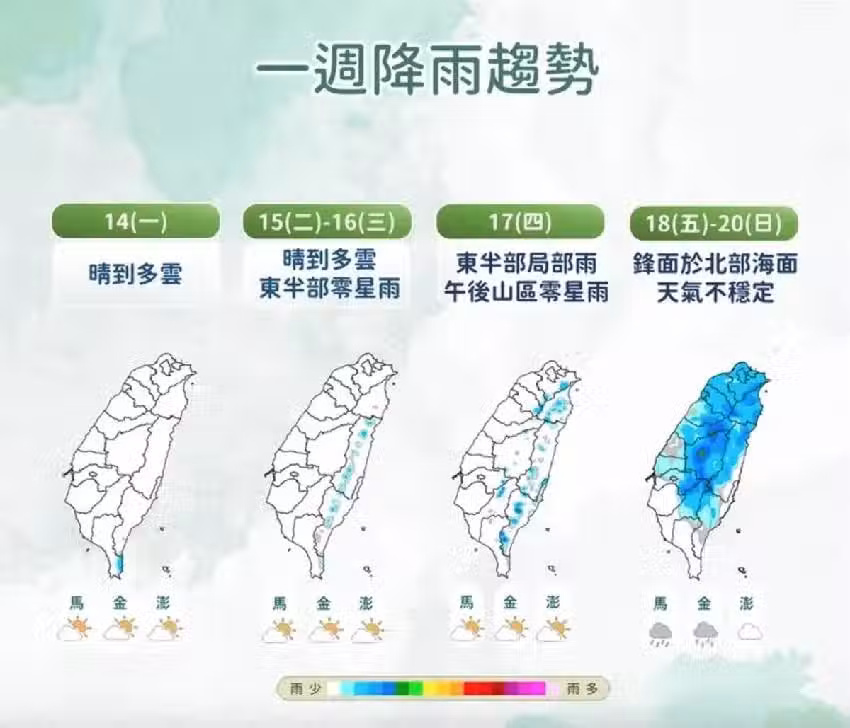 他表示,本周初至周四期間,與上周的狀態相比,台灣地區的大氣環境相當穩定,水汽含量偏低,大多數地區都會維持晴朗到多雲的天氣型態,降雨機率相當有限。