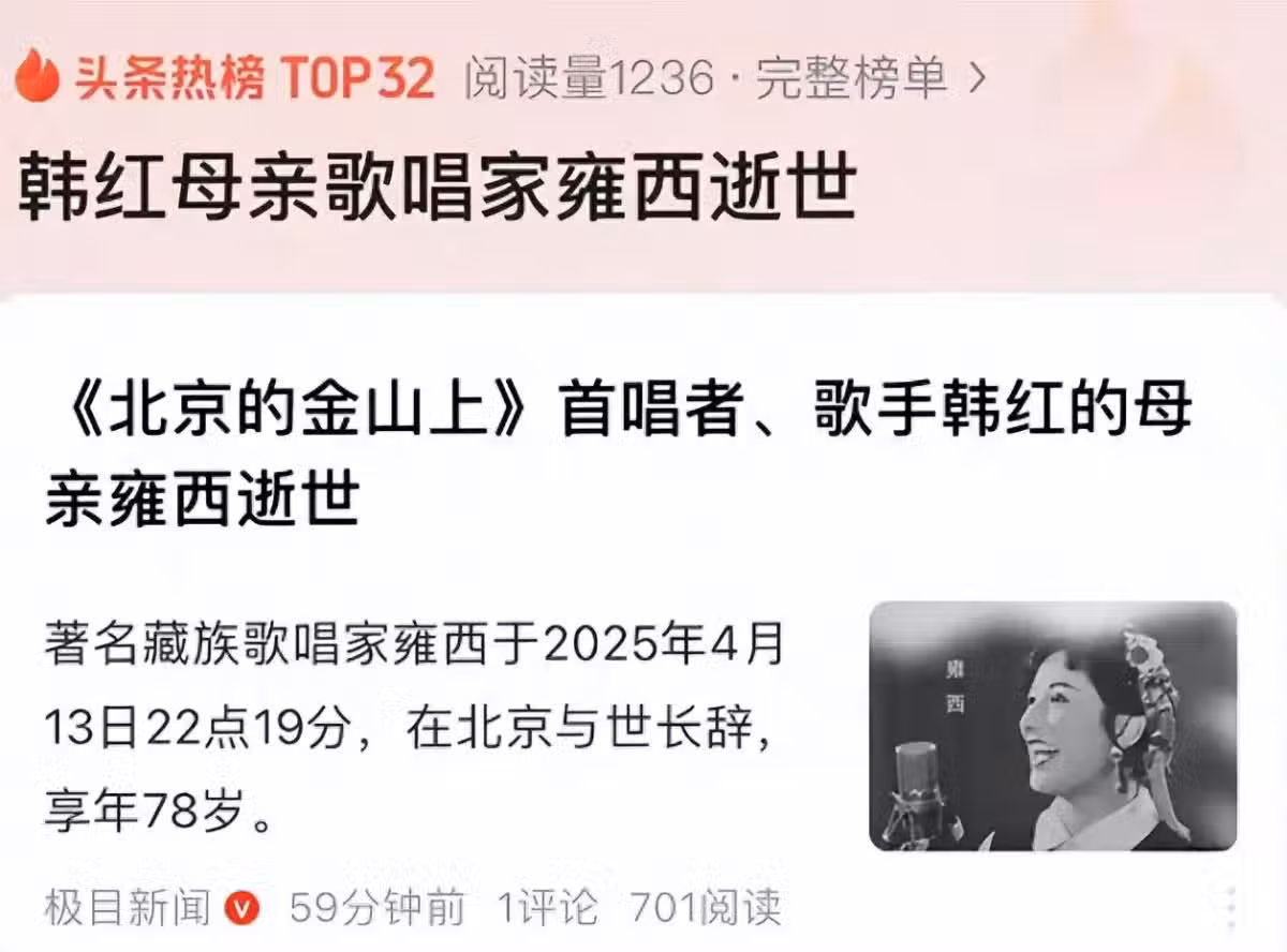 4月13日,歌唱家韓紅的母親雍西不幸去世,享年78歲,據悉,雍西是一位實力歌唱家,她是《北京的金山上》的首唱者,相信很多網友對這首歌都非常熟悉。