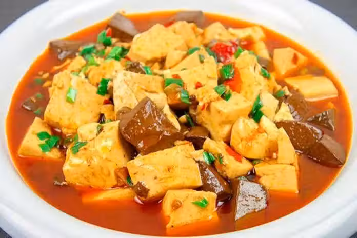 1.準備一塊嫩豆腐、切成方丁;豬血一塊,也切成同樣的方丁;大蒜拍扁、切成碎末,大蔥破開、切成蔥花,另外切一點韭菜花備用。