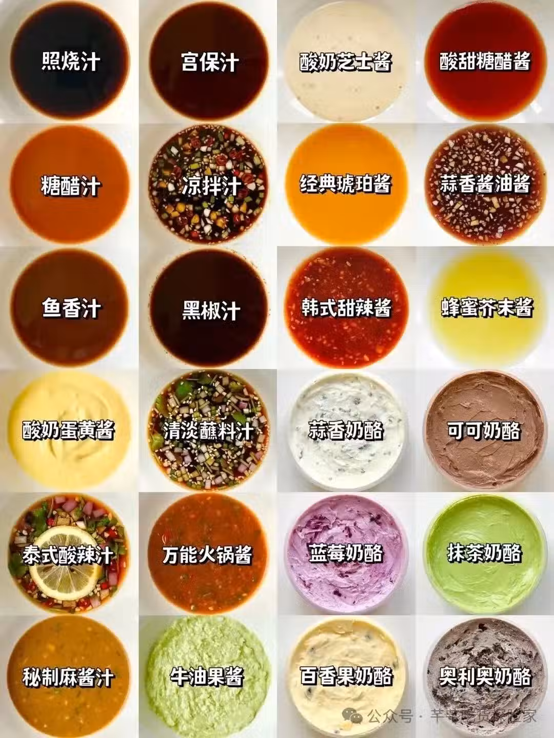 最近喜歡上了各式各樣的調料,炒菜的時候來一碗料汁,真的是太方便了,突然感覺自己會做的美食都多了。基本都是家庭常備的調料,需要的寶子們試試吧! 末尾附加幾款麵包、蛋糕常用的餡料。 ✅魚香汁 準備需要用到的調料:生抽,醋,蚝油,白糖,澱粉,清水。 ✅黑椒汁 準備需要用到的調料:生抽,老抽,蚝油,黑胡椒,澱粉,清水。 ✅涼拌汁 準備需要用到的調料:生抽,醋,蚝油,香油,白糖,鹽,蒜末,小米辣,蔥花,白芝麻。 ✅照燒汁: 準備需要用到的調料:料酒,生抽,老抽,蜂蜜。