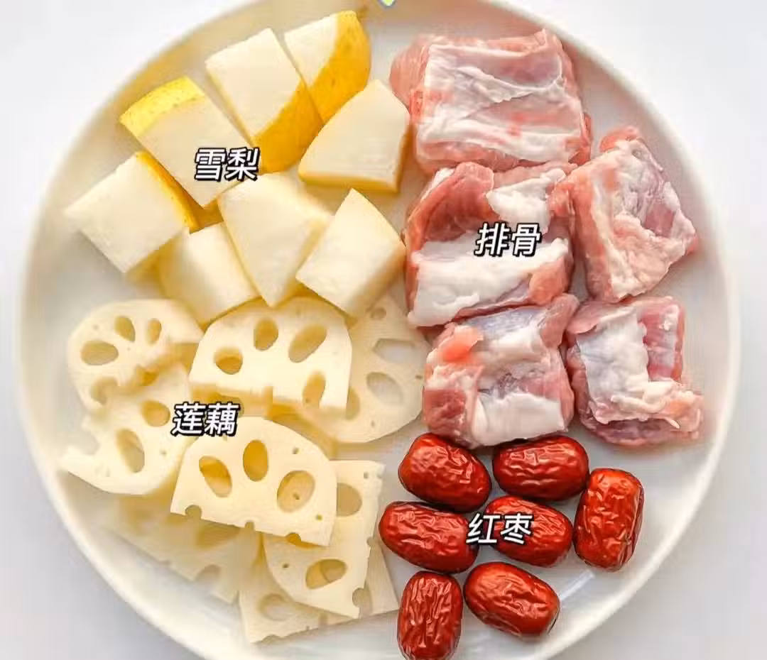 ❶姜切片,蔥打結,排骨斬成小塊洗乾淨,蓮藕去皮切塊,紅棗去核剪碎,雪梨用鹽搓洗乾淨表皮,去核切塊備用。