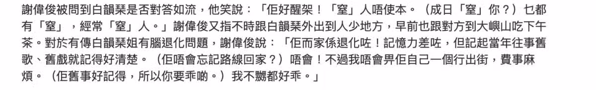 白韻琴過往罕見露臉,看起來精神不錯,不過在應對媒體的時候說話有些許口齒不清,且還一度被傳出腦退化的問題。從前謝偉俊一再否認白韻琴認知方面有問題,稱她仍然很精靈,而這一次再度被問及類似的問題都是會後,謝偉俊一改昔日的態度,很直接地承認白韻琴的確有腦退化的問題,他稱白韻琴口齒還是伶俐的,不時地會懟自己,但是腦的確退化了,記憶力變差了,只記得當年的往事,還是那些舊歌、舊電影。