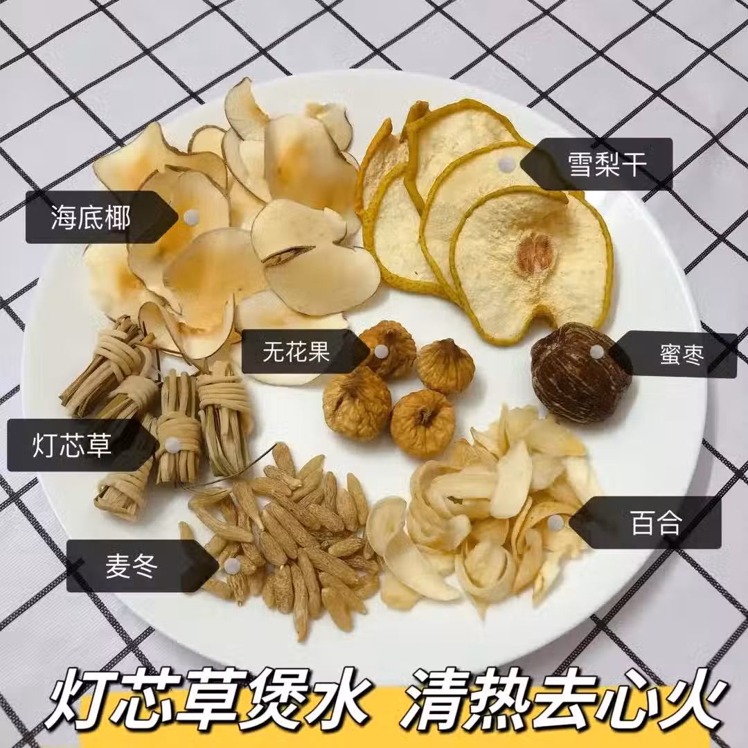 食材:燈芯草5小扎、海底椰15g、雪梨乾30g、麥冬15g、百合20g、無花果4粒、蜜棗1粒