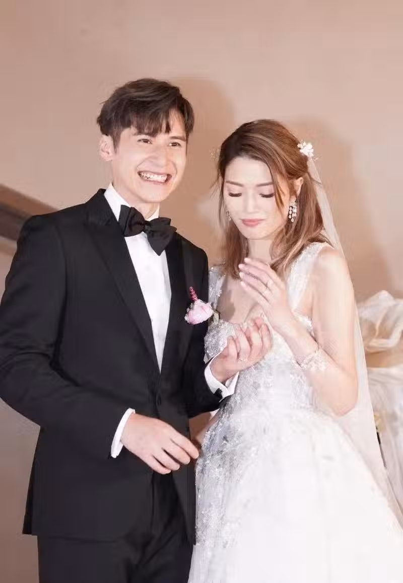她穿著低胸白婚紗,手上戴著3克拉的鑽戒,