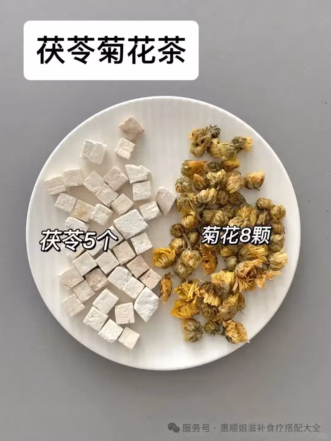 茯苓與菊花的搭配,以「健脾祛濕」為根基,以「清肝明目、清熱解毒」為特色,適合濕熱或者肝火上炎導致的頭面五官問題(如眼疾、咽痛等)。