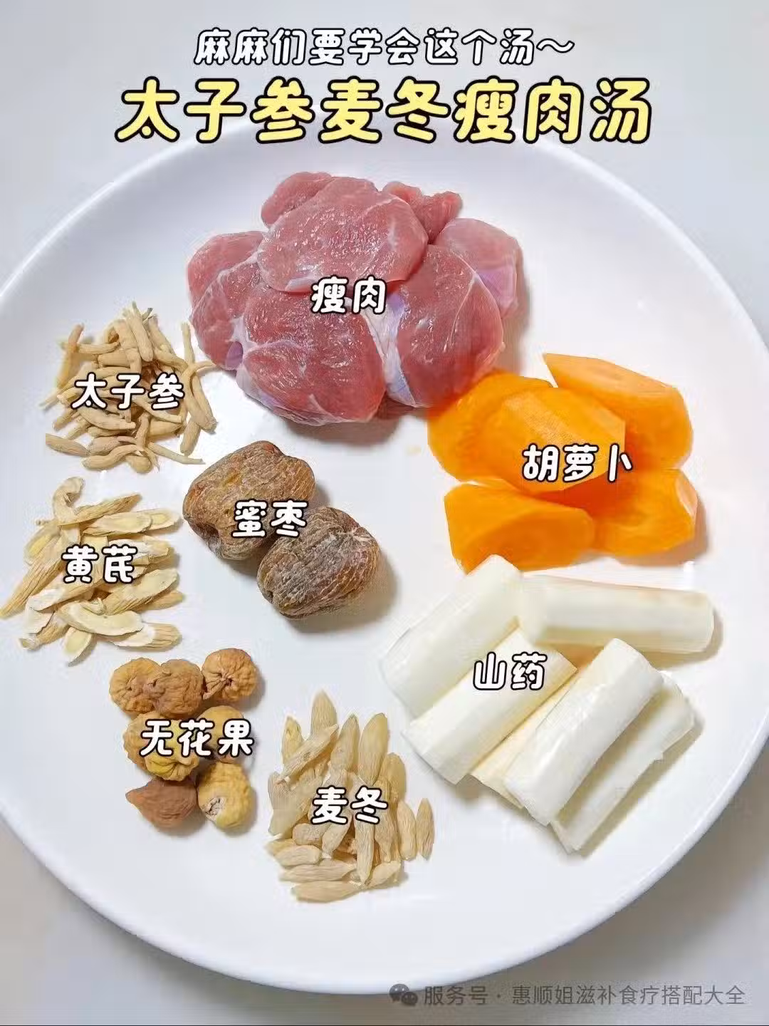 太子參15克、瘦肉300克、胡蘿蔔1根、蜜棗3顆、黃芪10顆、山藥200克、無花果3顆、麥冬10克
