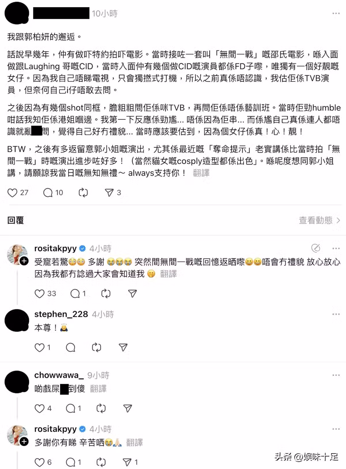 而另外一位曾與她在《無間一戰》中合作的特約演員也在社交平台發文,大讚郭柏妍友善又親切,表示起初並不知道她是誰,但合作後印象非常好。他表示,網絡上的批評未必貼近她真實為人,反而是因為她總是親自回應網友而被誤解不是本人。