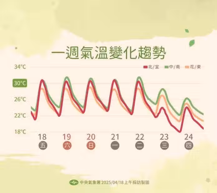 下周二晚間另一波鋒面將接近台灣,北部及東北部地區會轉為局部短暫陣雨或雷雨。