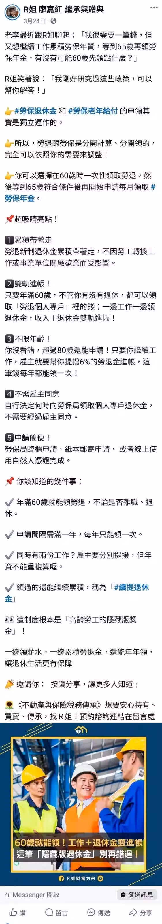 」形容勞退這制度是「高齡勞工的隱藏版獎金」,R姐指出:「一邊領薪水,一邊累積勞退金,還能年年領,讓退休生活更有保障。