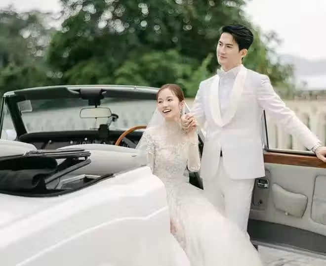 準新娘鄧卓殷則選擇了一條蕾絲白色婚紗。在眾多親人、好友的期待下,驚艷亮相。鄧卓殷本來就特別甜美,穿上婚紗之後,網友都忍不住感慨:絕對是最美新娘。