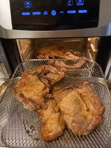 豬排分放在兩個氣炸鍋炸籃內,鋪開不要重疊,烤25分鐘。(梁志生提供)