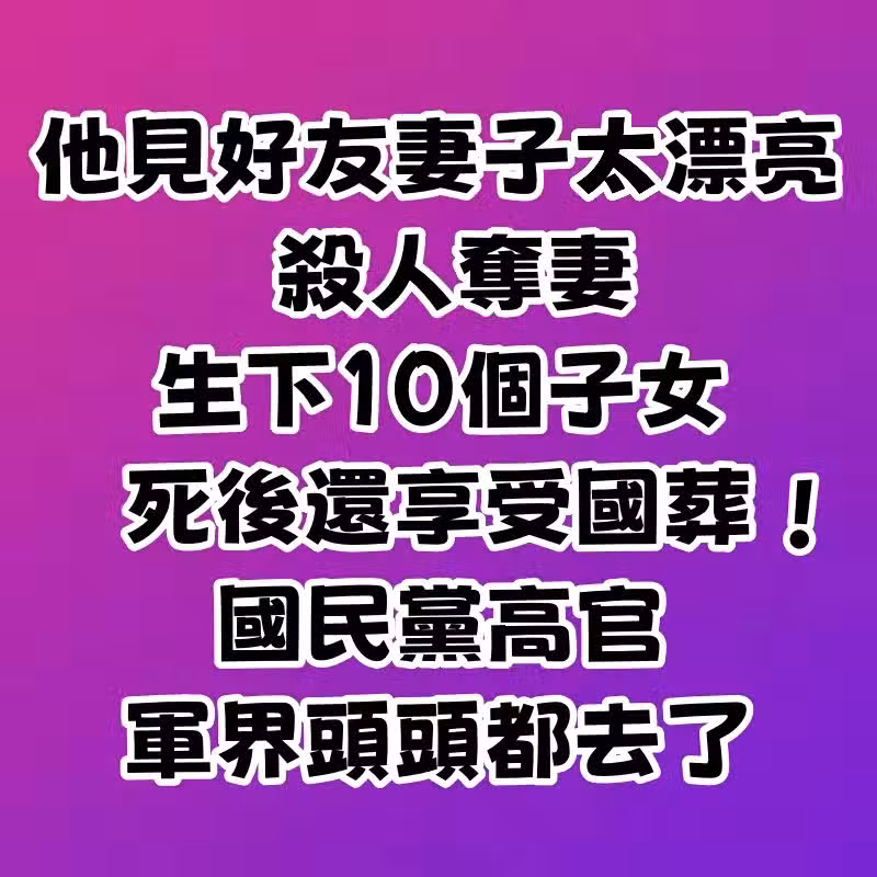 他見好友妻子太漂亮,殺人奪妻,生下10個子女,死後還享受國葬 !國民黨高官、軍界頭頭都去了!