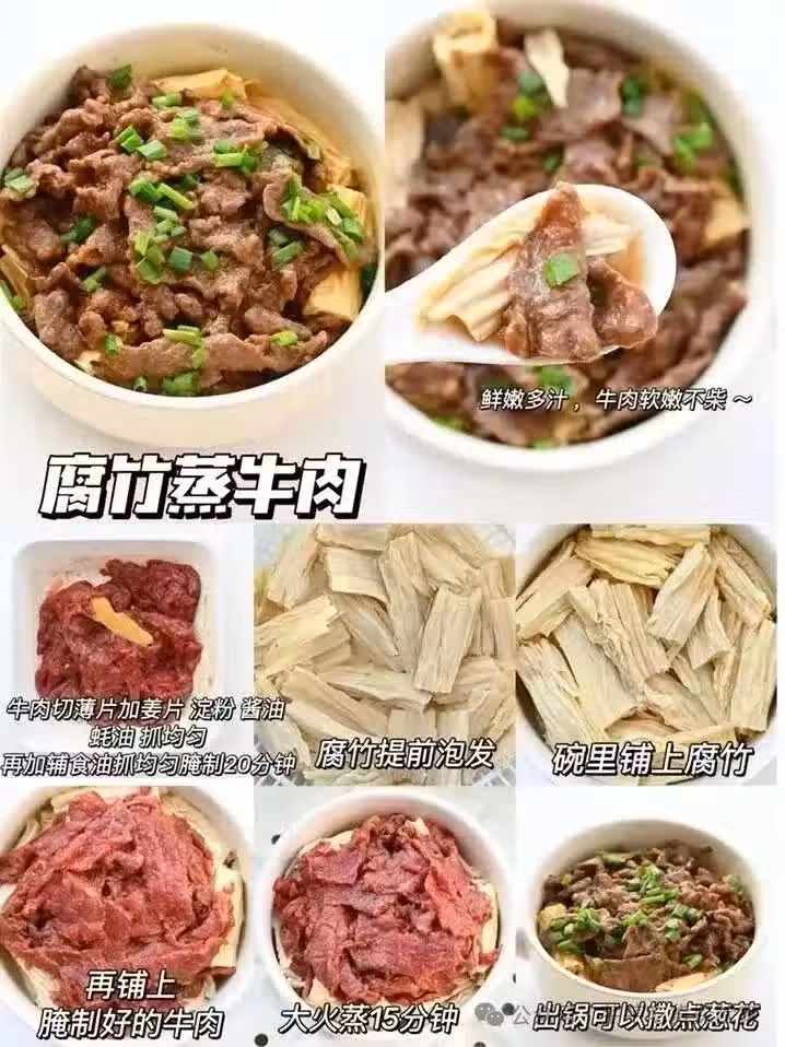 準備食材:牛肉,腐竹,薑片,澱粉,蚝油,生抽,食用油,鹽,蔥花。