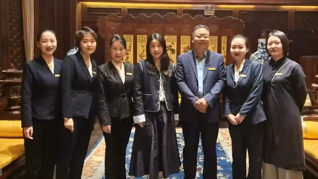 郭晶晶也和飯店裡的工作人員一起合影,鏡頭之中的她盡顯大家閨秀的氣質。