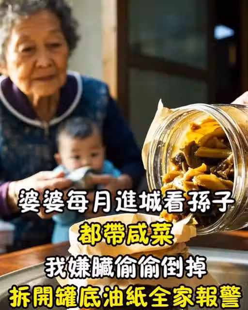 婆婆每月進城看孫子都帶鹹菜,我嫌髒偷偷倒掉,拆開罐底油紙全家報警