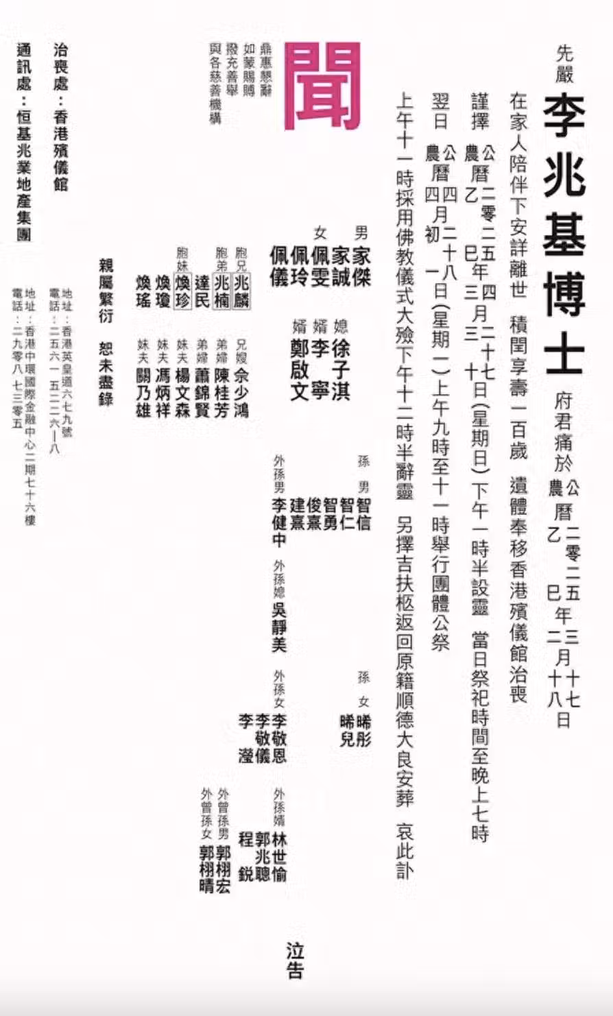 以劉惠娟當下的個人情況來看,她基本上是沒有必要,也沒有這個可能來出席李兆基的葬禮。首先,她與李兆基如今沒有任何關係,李兆基的訃文上也沒有她的名字,嚴格來說兩人是陌生人一般,何況離婚了之後,兩人40年沒有往來,愛恨情仇早就煙消雲散。再者,劉惠娟也已經年過90歲了,高齡老人,身體狀況如何不得而知,就算仍然很健康,但也不大適合出現在出殯的場合。
