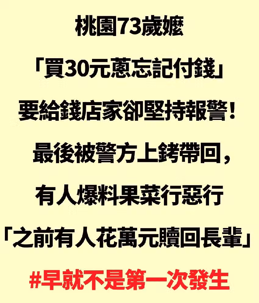 桃園73歲嬤「買30元蔥忘記付錢」,要給錢店家卻堅持報警!最後被警方上銬帶回,有人爆料果菜行惡行「之前有人花萬元贖回長輩!」 #早就不是第一次發生
