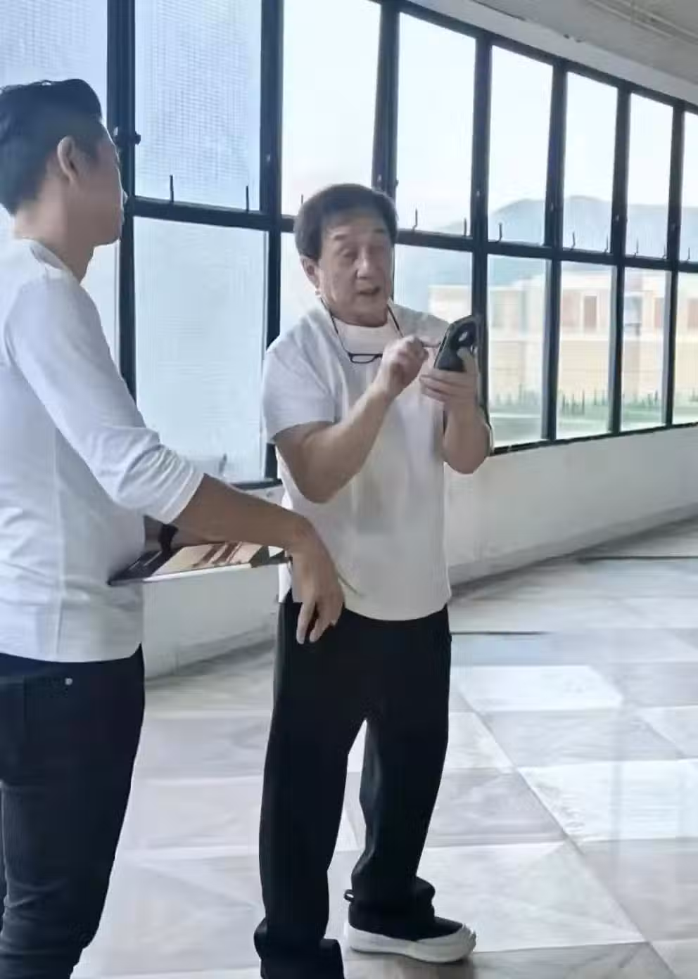 他手裡拿著手機,旁邊站著一位男士設計師,兩個人一直在溝通,成龍看起來有很多意見。
