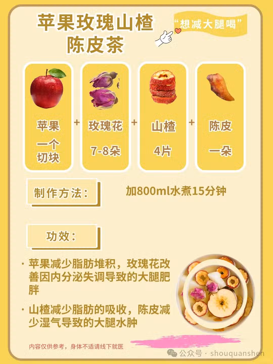 🌹 蘋果 + 玫瑰 + 山楂 + 陳皮:玫瑰有助於活血化瘀,山楂、陳皮有助於消食和排毒。喝了這款茶,大腿贅肉不見了,腿部線條越來越緊緻。