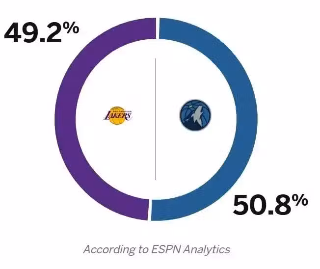 就在雙方將系列賽大比分打成1-1平後,權威媒體ESPN就雙方G3勝率給出了預測,其中回到主場的森林狼稍稍占優勝率為50.8%,而湖人勝率為49.2%,這也就說明在ESPN看來雙方几乎五五開!那麼你們認為呢?歡迎在評論區發表討論!