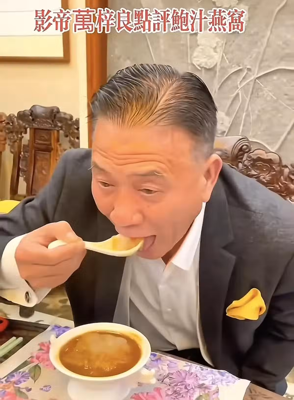 萬梓良中山品嘗燕窩,頭髮眉毛全白,疑戴假牙抽100元一包的香煙
