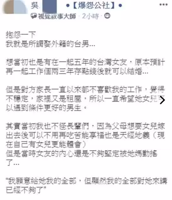而在分手後,他一直在想 「人生還有多少個五年可以浪費」,於是在3個月後,他決定直接到越南相親,把工作和條件全都公開透明化,他也不用再自卑自己的工作,害怕別人嫌棄他,而當越南的待嫁女子能接受他的條件,且同時他也對對方有好感,就可以直接完婚來台。