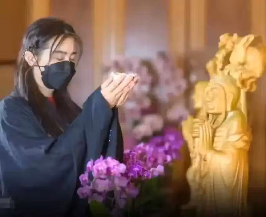 去年5月,有網友曬出王祖賢在大溫靈岩山寺的視頻截圖,芸芸眾生之中,她仍然是氣質超然、少女感十足的那一個。