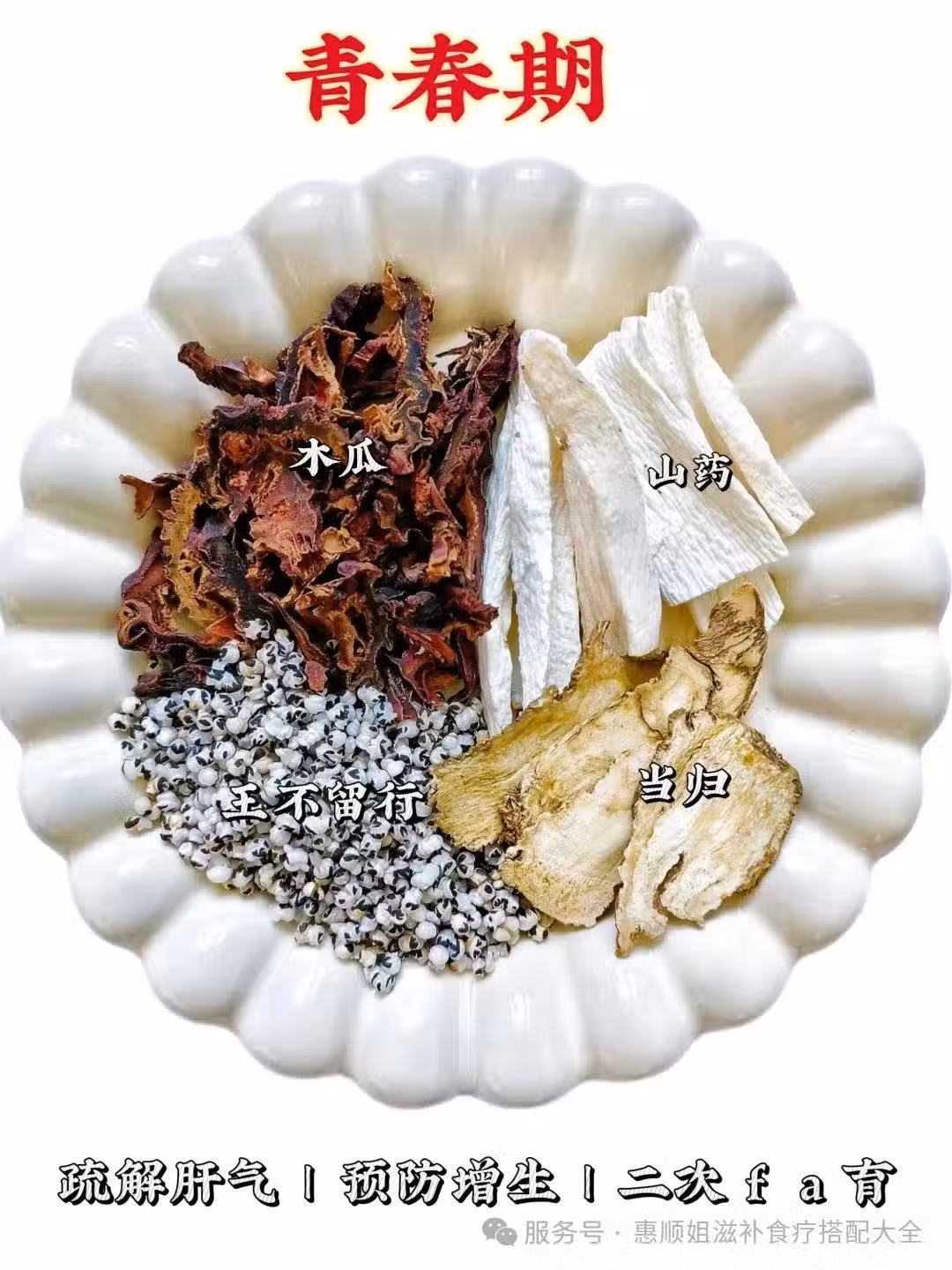 材料:木瓜15克、山藥20克、當歸6克、王不留行5克