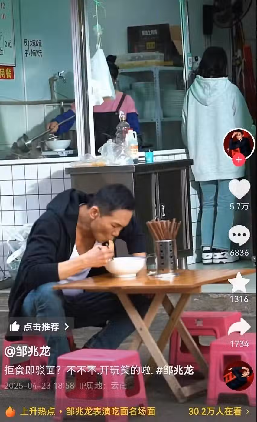 57歲鄒兆龍在雲南路邊攤吃面,那吃相可有點『狼狽』呢!脖子上青筋都暴起來了,這可勾起了大家的回憶啊。