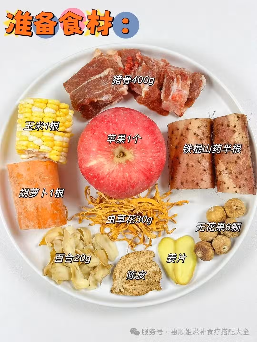 豬骨、玉米、胡蘿蔔、山藥、蘋果、蟲草花、百合、無花果、陳皮、薑片